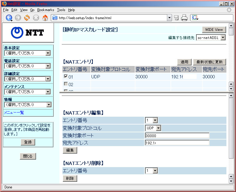 問題のポートを開く設定は、NTTのモデムルータの設定をこのようにやればOKでした。