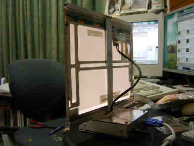 背面は導光板丸出しなので、光漏れします。(白く見えるのは実際に光ってます)今回はシャープ製のパネルですが、相変わらず上下視野角最悪で、角度調整機能の無い今のバージョンでははっきり言って見辛くて使い物になりません。